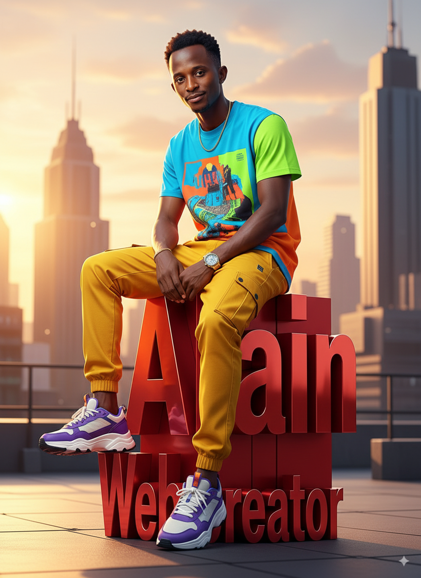 Create ultra-realistic digital art of a person (use reference photo) in a dynamic full-body pose. The subject wears casual relaxed outfits in bold colors (shirt, pants, shoes), appearing stylish and modern. Add a single text "Alain Web-creator" displayed vertically, rendered as large 3D block glossy letters in a bold contrasting color. The text should appear only once, without repetition, and be big enough to look like a real object. Make the model interact with the text, for example sitting on